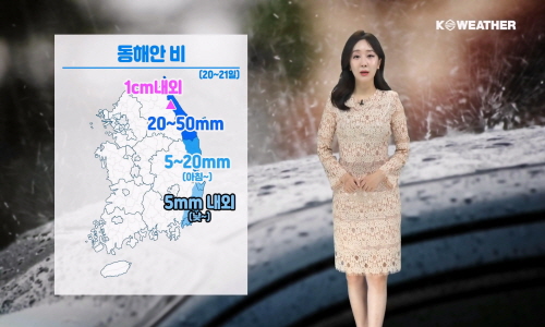 민간기상기업 케이웨더에 따르면 오늘(20일·월)은 중국 북부지방에서 확장하는 찬 대륙 고기압의 가장자리에 들겠다. 전국이 가끔 구름이 많은 가운데 동풍의 영향으로 강원영동 및 경북북부동해안은 흐리고 비가 오겠고, 경북남부동해안은 아침부터, 경남동해안은 낮부터 비가 오겠다. 특히, 기온이 낮은 강원영동북부산간은 눈이 섞여 내릴 때가 있겠다.
