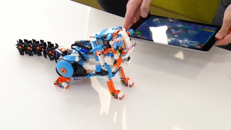 이번엔 트럭으로 변신한 블록들, 태블릿 PC로 이리저리 조종하며, 테이블 위의 블록을 들어 올립니다.