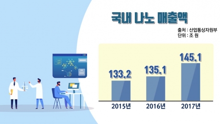 굉장히 많은 나노 제품을 사용하고 있는데요. 2018년도 산업통상자원부에 따른 조사를 보면 나노융합산업은 계속 증가하고 있는데요. 2017년 국내 나노 매출액을 보면 145조로, 2015년 133.2조 원, 2016년 135.1조 원으로 계속 증가하고 있습니다. 이런 매출액 외에도 나노융합기업 수나 고용인원도 점차 증가하는 추세입니다.