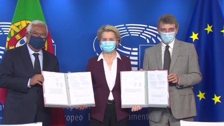 우르줄라 폰데어라이엔 EU 집행위원장, 다비드 사솔리 유럽의회 의장, EU 순회 의장국인 포르투갈의 안토니우 코스타 총리는 현지시간 14일 백신여권 관련 규정에 최종 서명했습니다.