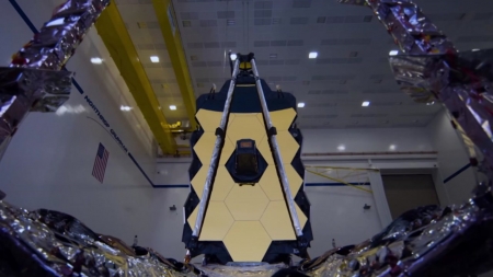 [빌 오츠 / NASA 고다드비행센터 JWST 프로젝트 매니저 : 제 뒤로 보이는 제임스 웹 망원경의 육각 거울 뒷면에는 모터가 달려 있습니다. 그래서 우리가 원한다면 모터로 거울의 모양을 바꿀 수 있고, 미세 조정도 할 수 있습니다.]
