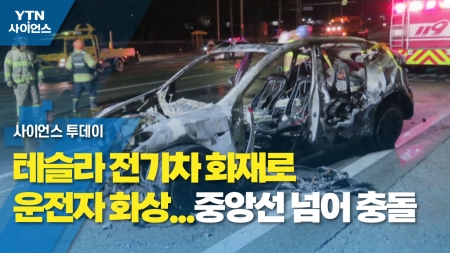 어젯밤 중앙분리대와 부딪힌 뒤 반대편 차선 차량과 충돌한 테슬라 전기 차량에 불이 붙는 사고가 발생했습니다.