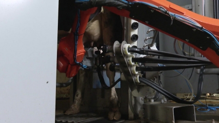 젖소가 착유실로 들어서자 로봇팔이 소의 유두를 탐지해 착유관을 끼웁니다.