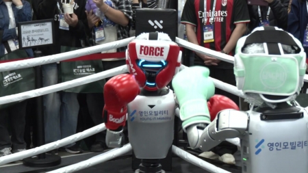 사각 링 위로 로봇 선수가 등장합니다.