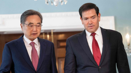 마코 루비오 국무장관과 악수를 한 조 장관은 협상 전망을 묻는 기자들의 질문에는 답변을 피한 채 회담장으로 들어갔습니다.
