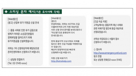 '긴급 수출바우처', '유류세 혜택지원', '주유 지원금'과 같은 단어를 사용해 가짜 웹사이트에 접속하게 한 뒤 개인정보를 탈취하거나, 기존 대출 일부라도 우선 상환해야 한다며 자금 이체를 유도할 수 있습니다.